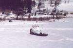 ice are the multi-lane freeways, hard packed snow many sleds wide. On weekends this area is a bee hive of activity. People visiting people, people just cruising around. Sometimes upwards of 500 snowmobiles participate in Poker Runs. On weekdays like today it's totally deserted, reminiscent of an episode of The Twilight Zone where not a single car could be seen in Los Angeles. No, wait, there's a sled, heading north! We detour over to exchange waves. Yesterday I flew by here in the opposite direction, returning from a ski fly-in hosted by the Midland chapter of the RAA. Not long after we passed, an icebreaker battered and rammed it's way through to two lakers trapped at a wharf months ago by the freeze.
