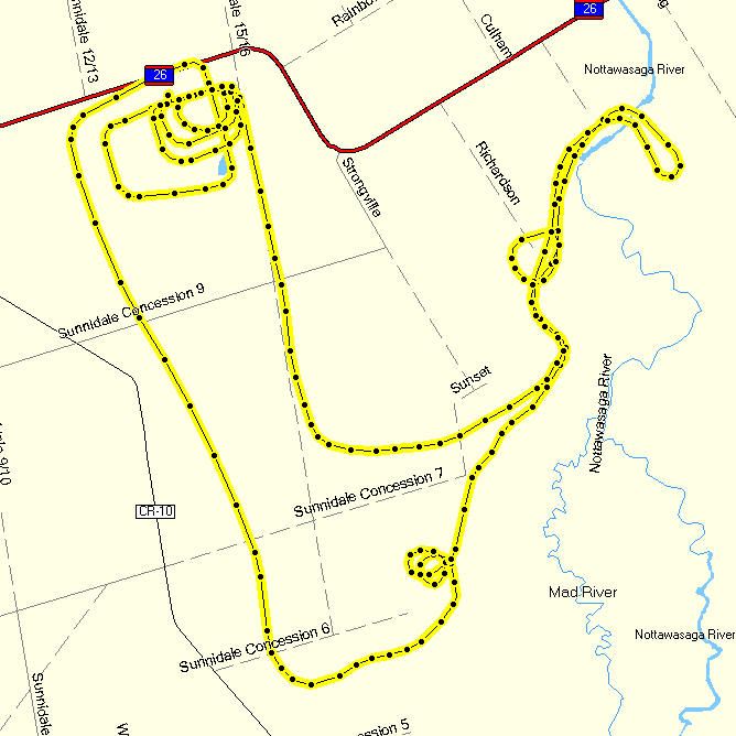 Letter to the Canadian Challenger email list from Bryan written April 12, 2007. Challenger Sights & Cinema Hello Challenger Fans, Spring is here and the amphibs are on my Challenger. Judging by the ice on the lakes though it will be a little longer before my floats actually get wet. Meanwhile, a large swamp about 4 miles from Edenvale Aerodrome has overflowed into the adjacent farmland and is providing amazing aerial wildlife viewing opportunities. On past flights to the swamp I've seen great blue herons, golden eagles and even a bald eagle. Talk about strange bedfellows! In Challenger flights this spring I have enjoyed seeing zillions of ducks and geese, a couple dozen white swans, and two sandhill cranes - all overnighting on their migrations north. Friday evening there were two coyotes standing at water's edge watching these delicious morsels bobbing around just beyond reach. Their mouths were watering! Little did the coyotes know there was a flock of about 50 wild turkeys foraging two fields over! Maybe the coyotes should have a spotter in a Challenger! The usual herds of deer were conspicuously absent - probably because their escape routes into the safety of the swamp were flooded. Often you can see foxes, raccoons and the occasional beaver. When I got home I downloaded the GPS track from the Garmin 296 to my laptop. Here's the flight path as shown by Garmin's MapSource: