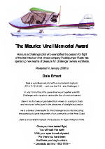 (Click the plaques above to enlarge and read the inscriptions.) The 2006 Vinet award went to Dale Erhart of Comox, BC. Dale is an A-340 airline pilot, retired CF-18 fighter pilot and extremely enthusiastic Challenger owner. Earlier in the afternoon he had given an interesting and informative session on building his Challenger and flying it on floats on the West Coast. In a short time Dale has become a reservoir of knowledge and experience as well as a sparkplug to ignite the growth of the Challenger on the West Coast. In 2006 a Special Vinet Award was given to Ian Coristine who had retired from National Ultralight, the Canadian distributor of the Challenger. Ian was a pioneer in the ultralight movement in the late seventies and he spearheaded the introduction of the Challenger in Canada in the eighties. His long distance flights plus his articles, photographs and video have inspired countless others to join our world.