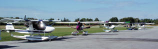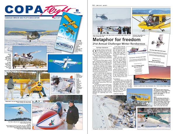 In August 2000 a group of Challengers became the first Canadian ultralights to attend Oshkosh with its 10,000+ aircraft and nearly 1 million people! This marked the opening of the United States border to Canadian ultralight aircraft and pilots. In a historic role, the Canadian Challenger Owners Association spearheaded the regulatory changes to permit such cross-border flights. Accolades were received from the EAA and COPA as well as from the FAA and Transport Canada! In 2010 a Challenger flock returned for the 10th anniversary. Intro | History | Setting | Agenda | Awards | Tour | Flocks | Directions | Reservations | Contacts CHALLENGER FLOCKS Again this year, groups of owners of ski-equipped Challengers are planning to fly in formation to the Challenger meet, adjusting their itineraries to allow other Challengers to join up en route. We would like to extend an invitation to other Challenger owners to join them and participate in an aerial odyssey.