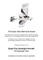 The Dave Allan Memorial Award was founded in 2007 to be given each year to a member of the Challenger community who has made a substantial contribution of a technical nature. Dave Allan passed away from cancer in 2006. Dave was an extremely talented and knowledgeable Challenger builder and inspector. He gave freely of his time to owners across Canada who called for advice and he welcomed visitors to his workshop. The 2013 Dave Allan Memorial Award was given on the 30th anniversary of the Challenger to the entire Challenger Team at Quad City Ultralight Aircraft Corp. Quad City has produced not just the most popular ultralight in Canada but one of the most popular and long lasting in the world. The Challenger line of aircraft was launched in 1983 and has enjoyed continuous improvements ever since. To illustrate the staying power of the marque, Challengers swept all the Light Sport awards at Airventure Oshkosh in 2013! The award was accepted by general manager Karen Oltman on behalf of everyone at the factory in Illinois. Click here for the list of past award winners - it makes very interesting reading! Intro | History | Setting | Agenda | Awards | Tour | Flocks | Directions | Reservations | Contacts FLOAT TOUR You may recall that in 1999 an intrepid group of voyageurs made an eight day, 2,000 km trip in their amphibious Challengers. (See Float Flying Adventure.)
