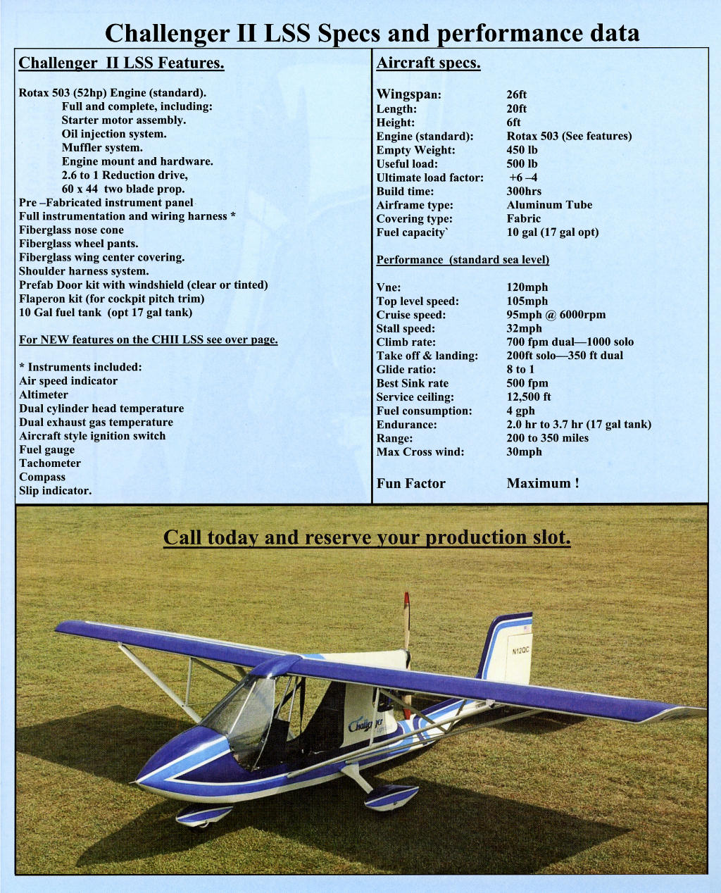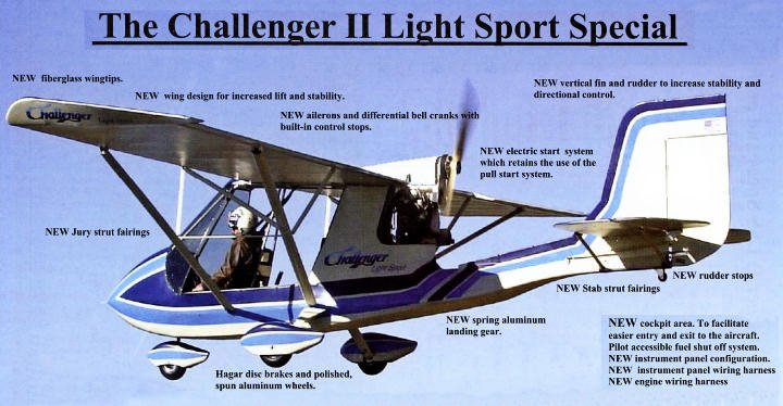 Overview Of The New Challenger II Light Sport Special Now Available In Canada The new Challenger II Light Sport Special is the most dramatic step forward ever taken by Quad City. The LSS incorporates numerous design enhancements driven by customer inputs. The goals were to make the plane easier to fly, faster in cruise, more rugged, more ergonomic and easier to build - all while keeping the price around US$25,000 with engine and instruments. The new two seat Challenger II LSS positions itself beside the S-LSA's and E-LSA's of the US Light Sport Aircraft category. Challengers emphasize the fun of building and flying your own airplane whereas virtually all of the new LSA's follow the Cessna tradition of hermetically sealing the occupants away from the flying experience. Challengers also emphasize the philosophy that recreational aircraft should be affordable to acquire and affordable to operate and maintain. The price tags of the latest LSA's are well over $100,000 which is completely out of reach for most recreational aviators! The handling characteristics of the new Challenger LSS are light and responsive. This is a feet on the floor airplane whereas classic Challengers require attention to the rudder pedals. With full aileron deflection you can roll from a 45 degree left bank to a 45 degree right bank and back again without using the rudder pedals! This is a direct benefit of the much larger vertical stabilizer and rudder as well as the implementation of new ailerons with differential bellcranks. The larger vertical tail is readily obvious from 50 paces, actually 50 miles, much like that of the C-130 Hercules! (Click the image below to enlarge.) Cruise speed has increased to 95 mph and maximum level speed to 105 mph. The new wing design reduces drag while providing increased lift and stability. It is readily identified by its smooth leading edge and bottom ribs plus flush gussets attaching the ribs to the leading and trailing edge spars. Further drag reductions were effected by adding streamline fairings to the jury struts and stab struts. The new solid aluminum main landing gear reduces drag by enabling use of improved gear leg fairings and eliminating all external cables. The internal carry through structures in the fuselage have been beefed up substantially. This new landing gear readily absorbs the bumps of rough farm fields and less elegant landings. The new hydraulic disc brakes make for very short stops. Entry and exit is made easier by the redesigned cockpit side rails, doors and windscreen.The new instrument panel allows more instrumentation while still providing good leg clearance for taller pilots. The new Quad City designed electric start system operates through the PTO end of the engine allowing a backup manual starter to be simultaneously installed at the MAG end. The LSS quick-build kit is even easier and more fun to assemble. As with all Challengers it includes factory-built tail, wings and fuselage with controls installed. New for the LSS are a precut anodized panel plus prefab door kit with windshield as well as wiring harnesses for panel and engine. No special tools or skills are required. Realistic build times are in the neighborhood of 300 hours. A vastly better new manual has clear drawings, color pictures and punchy text. Support is readily available across Canada via phone and email as well as face-to-face through an extensive network of dealers and professional Challenger techs. For owners who assemble their kits at odd hours there is unmatched 7x24 support via web sites and online forums.