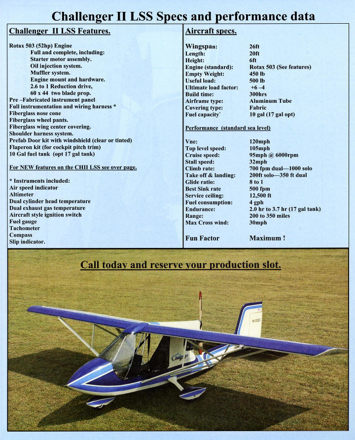 The Challenger Light Sport Special can be registered in Canada as an Advanced Ultralight or under the 51% rule as an Amateur-Built. The LSS has a number of new features to facilitate the Amateur-Built route, for example control stops and pilot accessible fuel shutoff system. In addition to the satisfaction of assembling your own airplane and knowing it inside and out, a big advantage to registering as Advanced Ultralight or Amateur-Built is that you can do any and all maintenance and inspections yourself or with the assistance of whomever you choose. The Advanced Ultralight category allows up to 100% of the assembly to be done by pros. The Challenger II Light Sport Special may be flown with the economical Ultralight Pilot Permit or with a traditional pilot certificate such as a Recreational or Private. The Challenger II Light Sport Special package is around US$25,000 for a quick-build kit including engine and instruments. To spread out cash flow the package may be split into airframe and powerplant sections or into tail, wings, fuselage and engine sub-kits. In today's economy the economics of aircraft ownership are more critical than ever before. The Challenger Light Sport Special is less than a quarter of the cost of typical AULA and S-LSA aircraft. The low acquisition cost and very low operating and maintenance costs mean owners can afford to go flying as often as they wish. The new Challenger Light Sport Special delivers wide ranging major improvements while retaining the docile nature of classic Challengers including low stall speeds with no wing drops. Also retained are the outstanding STOL operations with takeoff and landing rolls in the 200-400 ft range as well as impressive crosswind capabilities. Payload is a very useful 500 lbs. The versatility to go fast or to go low and slow, the capability to operate from short unimproved strips, the ability to fly with the doors off like a roadster with the top down and the unmatched visibility from both seats all combine to put the fun back into flying. Well over fifty Challenger Light Sport Specials have already been sold and the expectation is for many more. (Click the image below to enlarge.) If you wish, we'll notify you by e-mail when we expand this section! State 'LSS' in Comments.