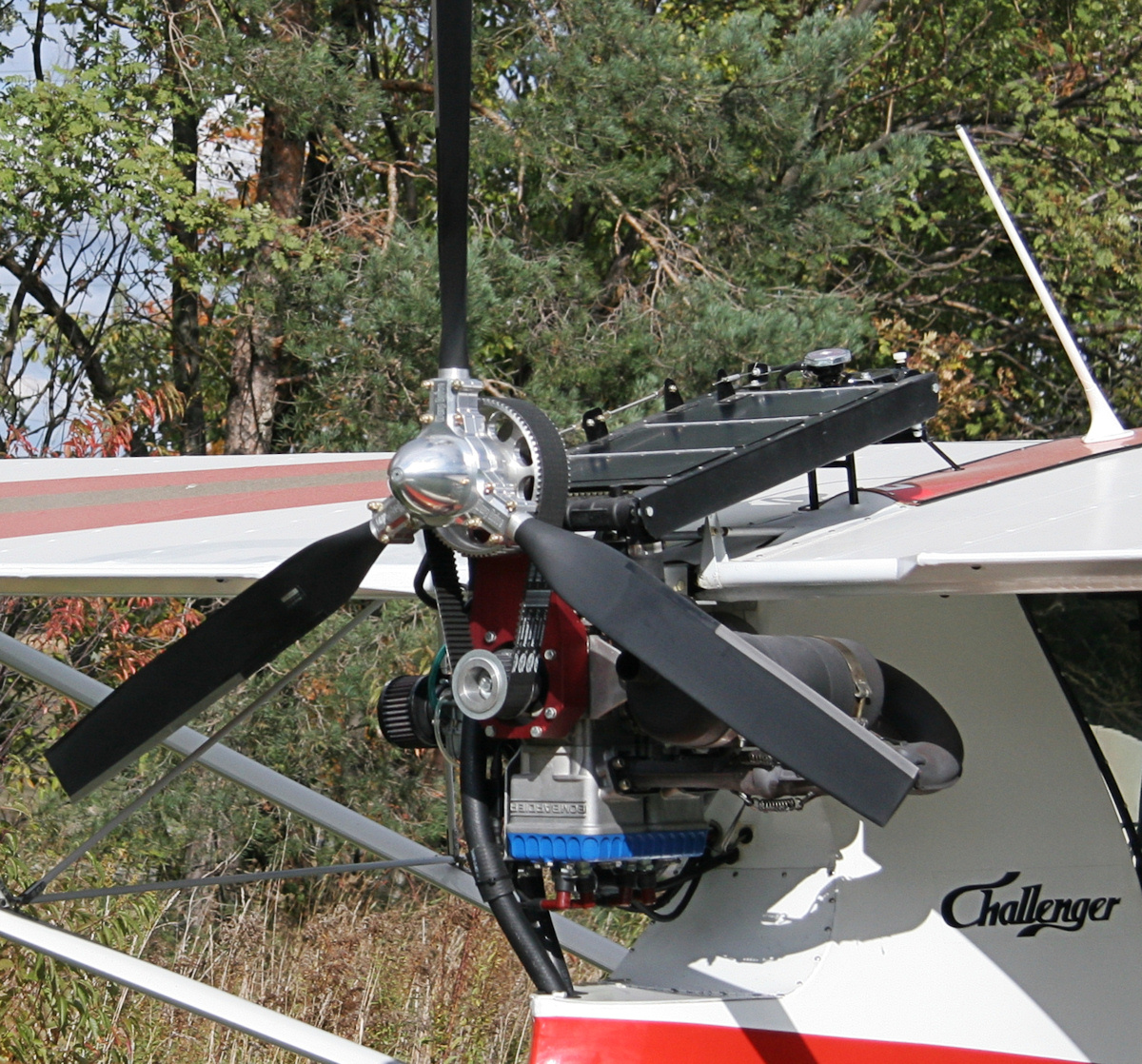 The 582 engine, 2.6-1 reduction drive and Warp prop combination are well suited to amphibious float operations with the light weight, big wing Challenger. The silver-coloured strips on the leading edge of the prop